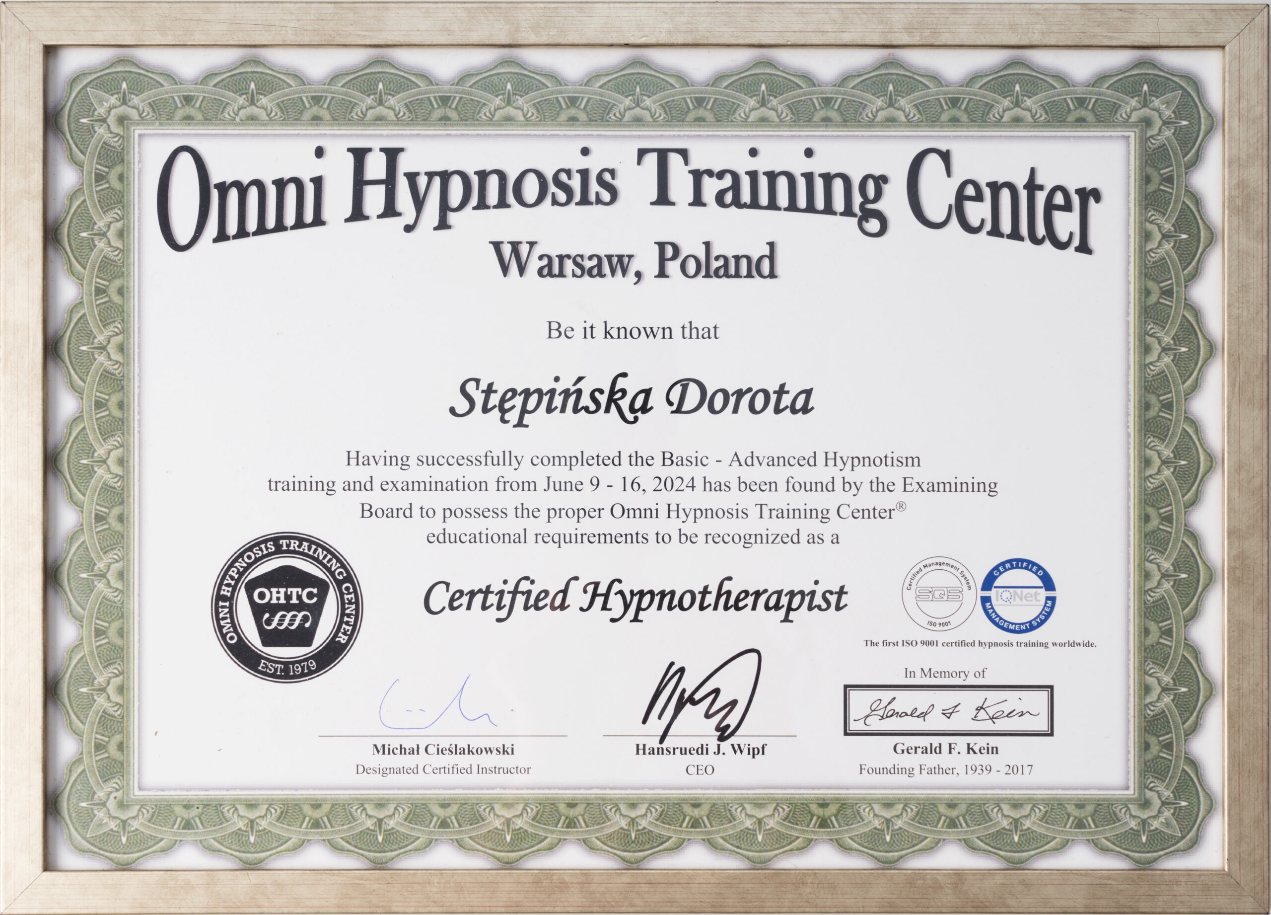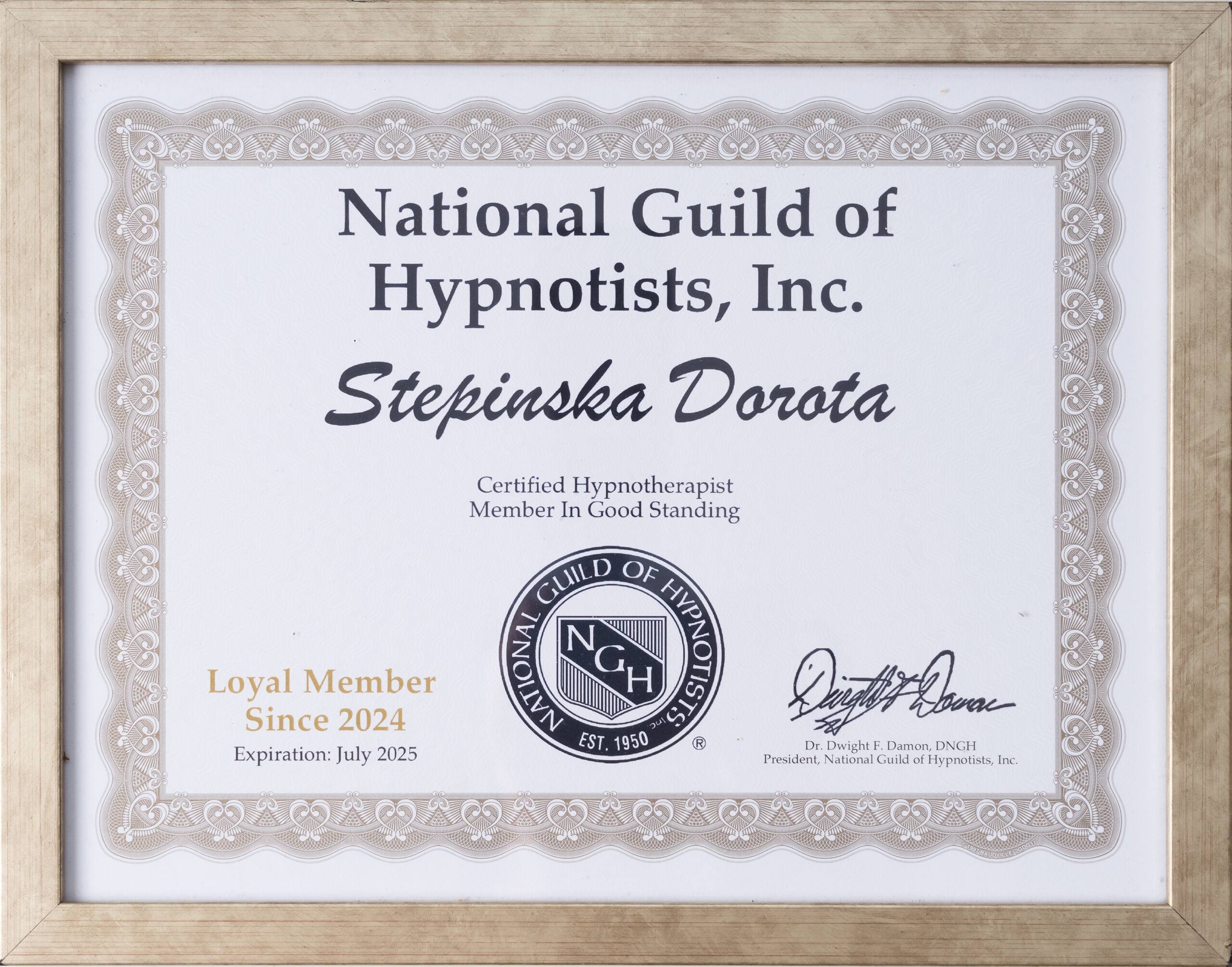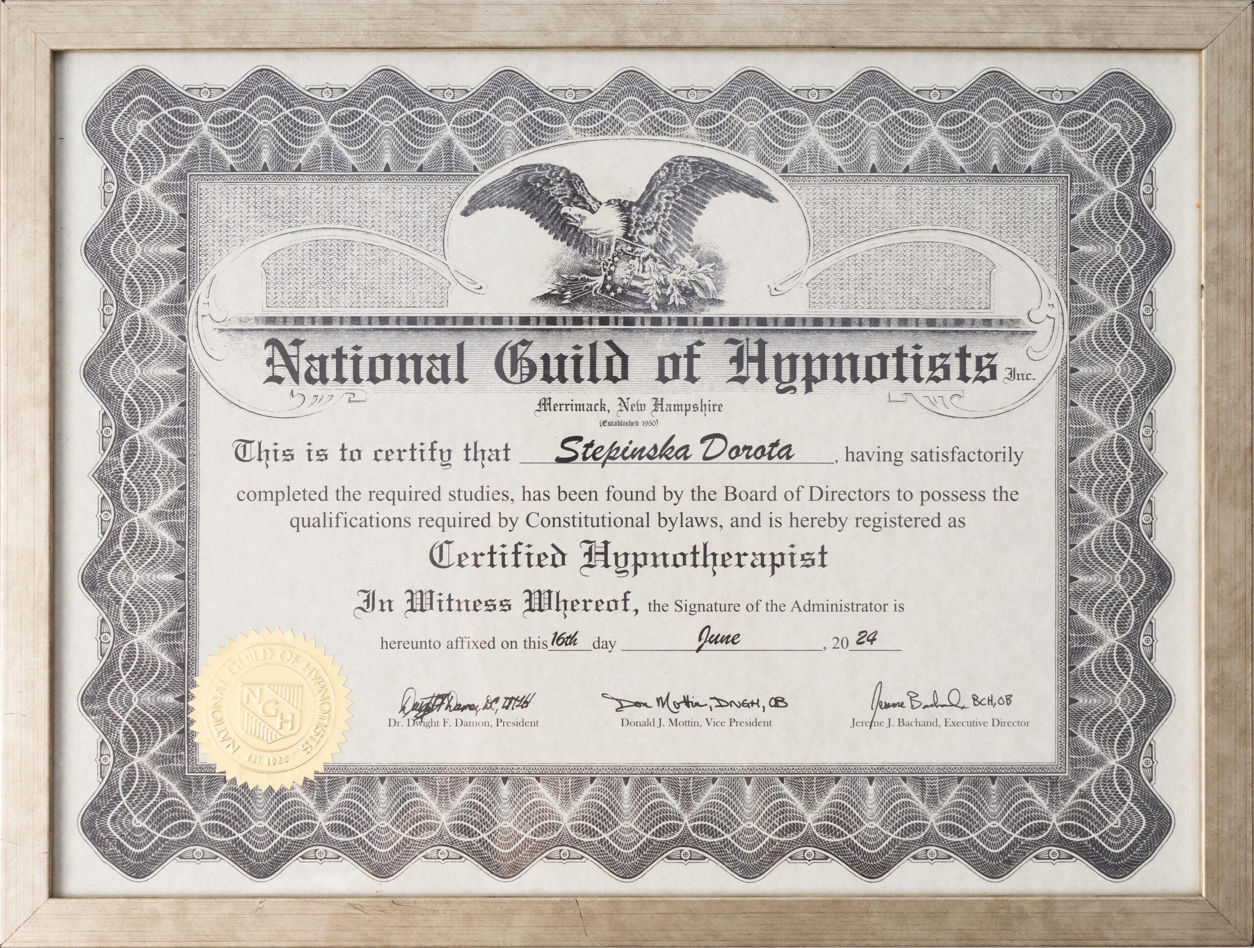 Certyfikaty: The National Guild of Hypnotists, członkostwo w globalnym stowarzyszeniu hipnoterapeutów.