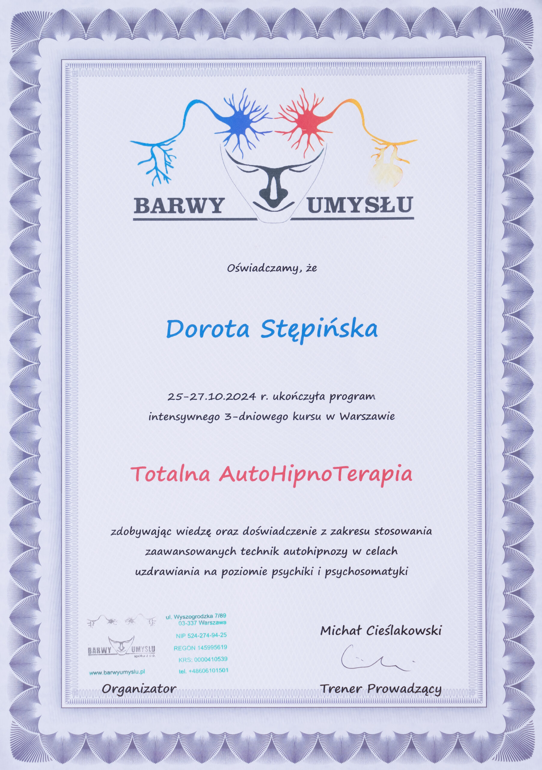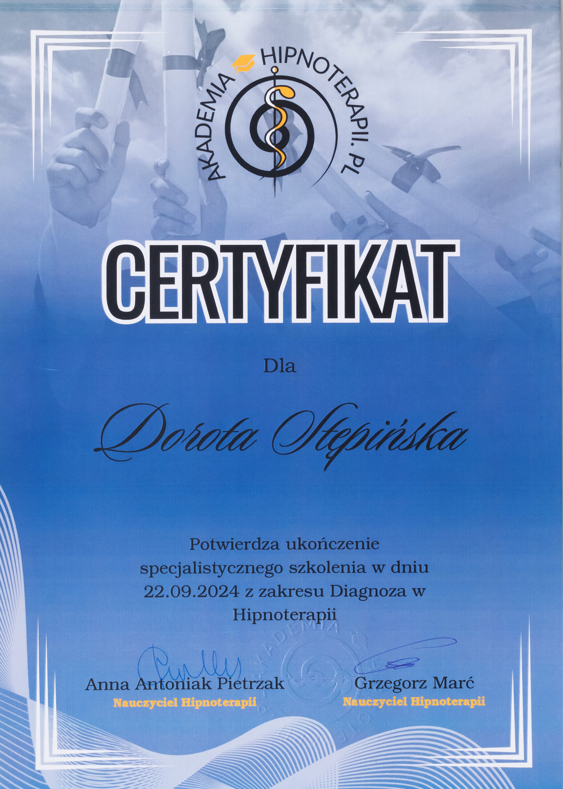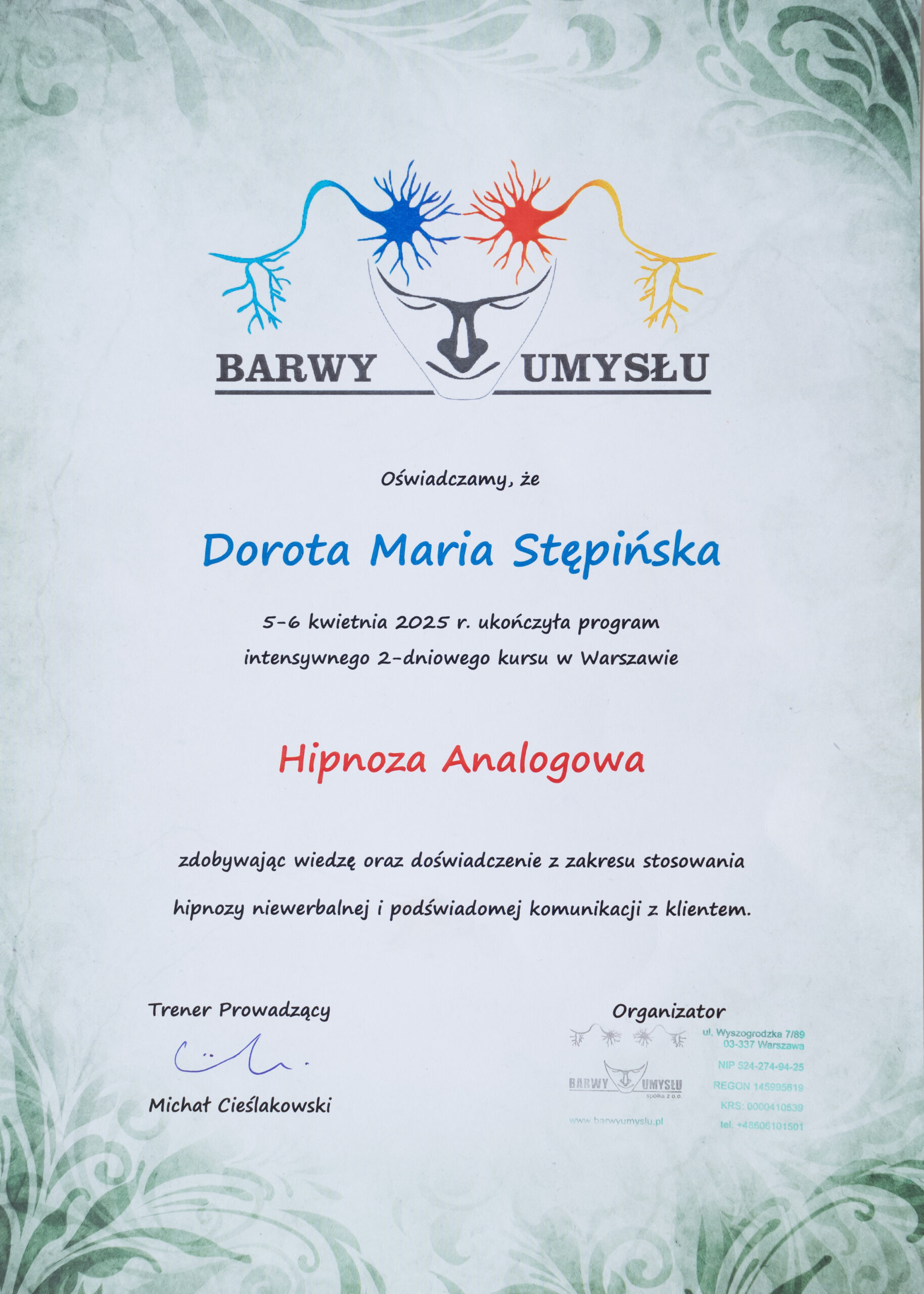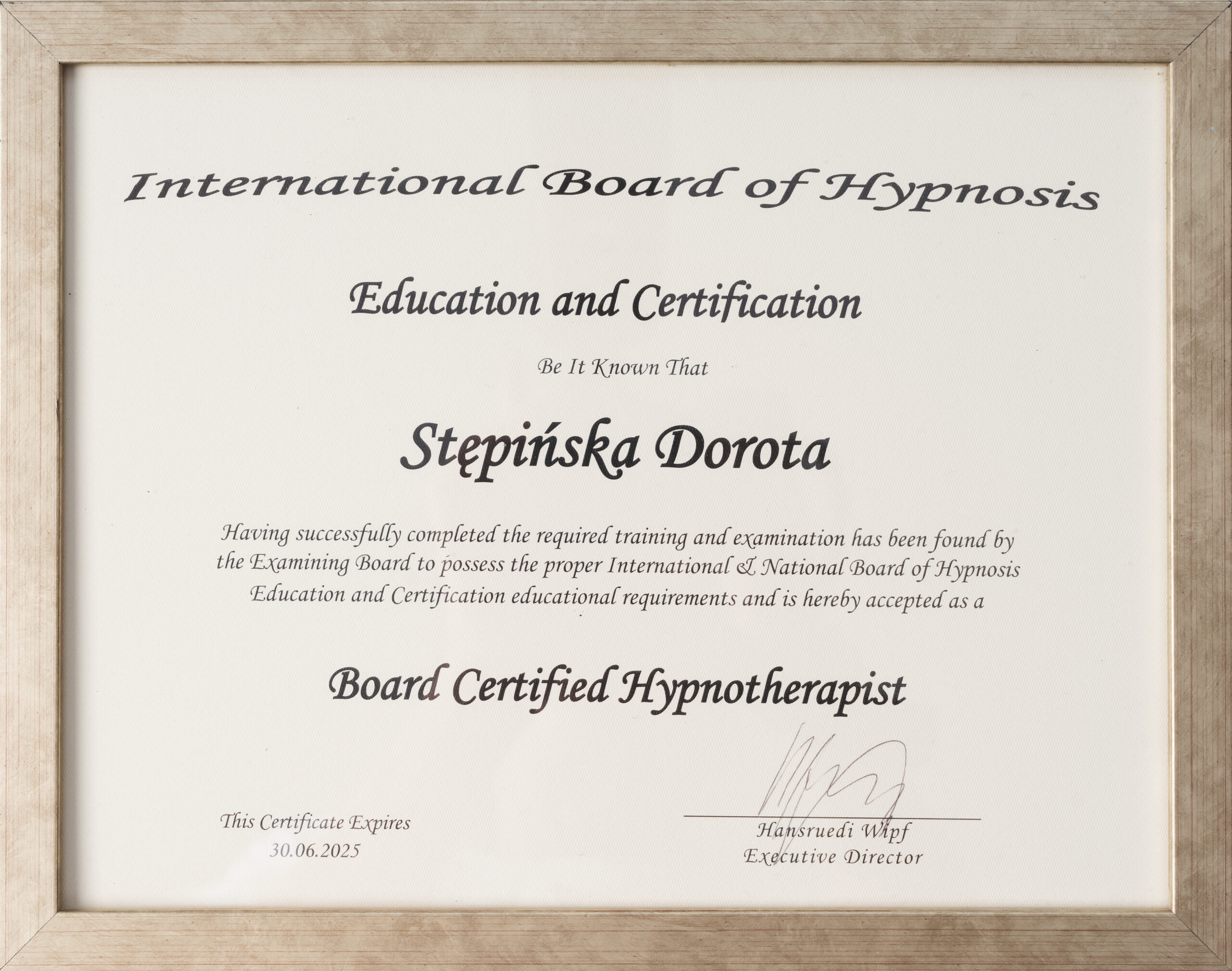 Certyfikaty: The National Guild of Hypnotists, członkostwo w globalnym stowarzyszeniu hipnoterapeutów.